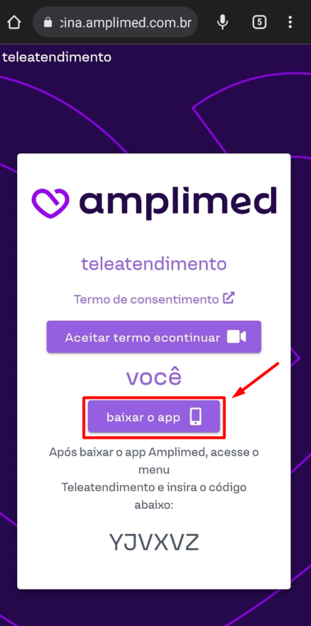Ou também, quando o profissional te enviar o link da consulta, abra no navegador e irá aparecer esse botão para baixar o app: