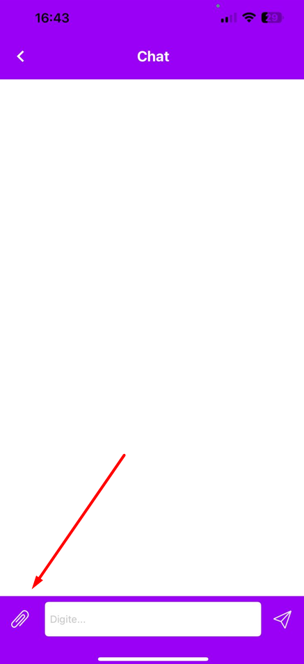 Com o paciente já dentro da sala de atendimento no aplicativo, deve acessar o Chat da sala e clicar no Clips "📎", após isso, deve escolher se deseja selecionar um foto da galeria, tirar um foto ou escolher arquivo.