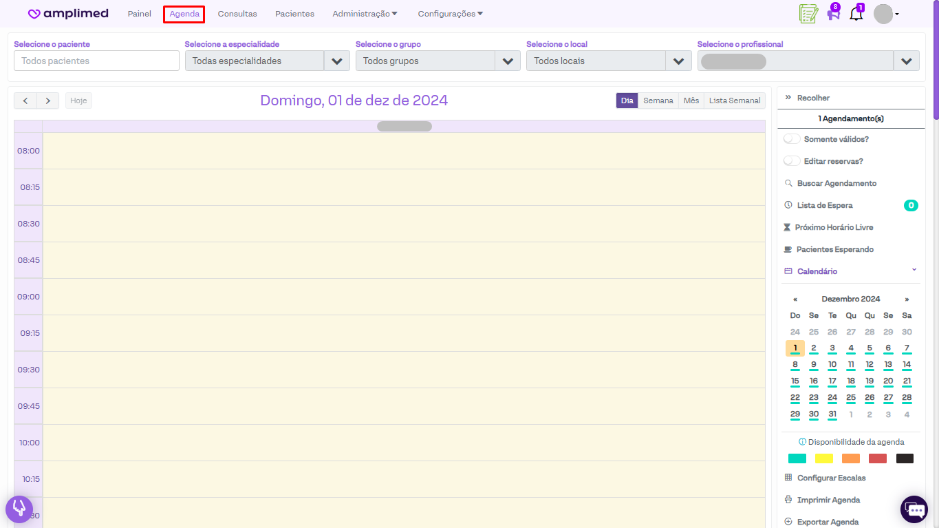 A aba "Agenda" é o local em que são registrados os agendamentos da clínica. Nela será possível adicionar as particularidades de cada um dos seus agendamentos criados, conforme a configuração realizada. Além disso, existe a possibilidade de se utilizar filtros para que seja possível visualizar a agenda de cada um dos profissionais (de forma simultânea ou não), ver e criar agendamento por local, por grupo e ainda por especialidades. E ainda existem outras opções e funções que podem ser utilizadas para facilitar o uso da agenda, se adequando da melhor maneira ao fluxo de sua clínica.