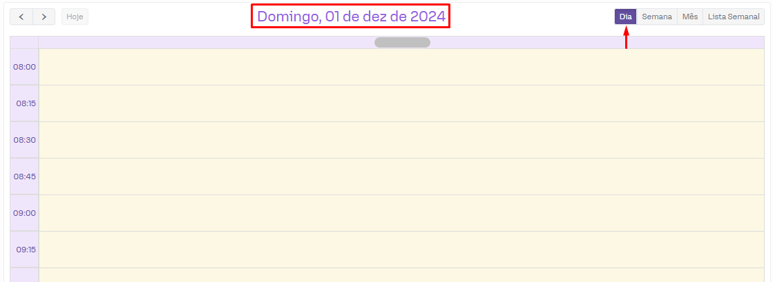 Esta opção é utilizada para visualizar apenas um dia por vez, sendo possível navegar entre cada um dos dias e verificar a agenda para somente o dia escolhido, que aparecerá pouco acima do espaço da agenda.