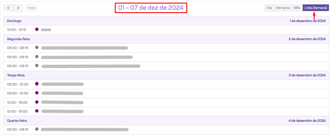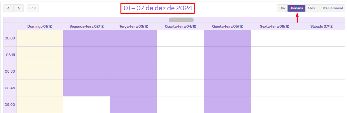 Esta opção é utilizada para visualizar uma semana por vez, possibilitando a navegação entre as semanas da agenda. O período da semana selecionado aparecerá pouco acima da grade da agenda.
