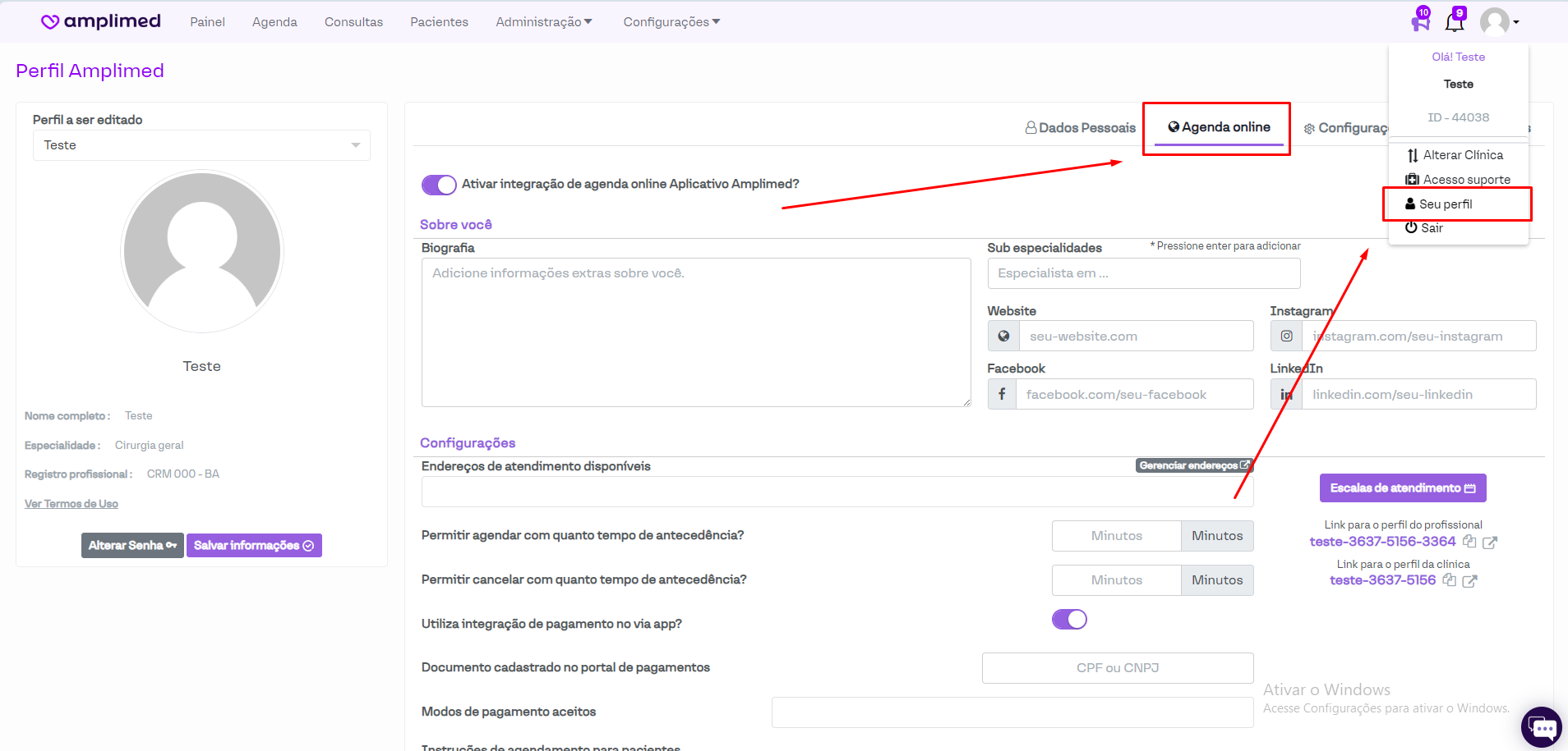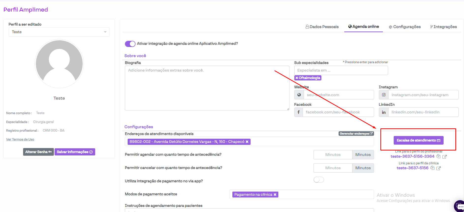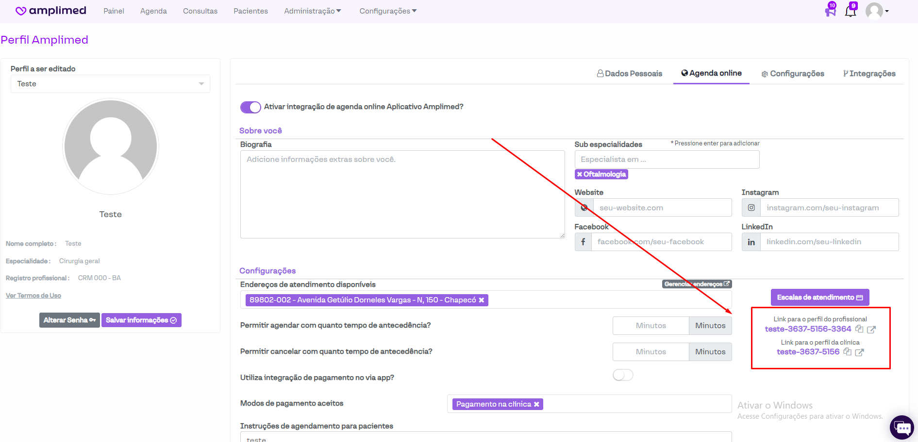 São dois links disponíveis. O link para o perfil do profissional, que irá direcionar diretamente para a agenda do mesmo e o link para o perfil da clínica, onde o paciente será direcionado para o campo de seleção de profissionais, podendo escolher com qual profissional atuante da clínica ele deseja ser atendido.