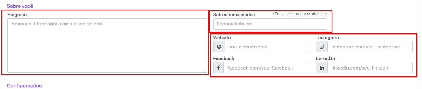 O campo Sobre você é onde o profissional pode adicionais informações pessoais e profissionais que julgar necessárias. Nesse local existem as opções de incluir links que direcionam o paciente para suas redes sociais, além do campo "Biografia", onde profissional pode descrever suas formações e especializações, assim auxiliando o paciente a saber mais sobre o mesmo.