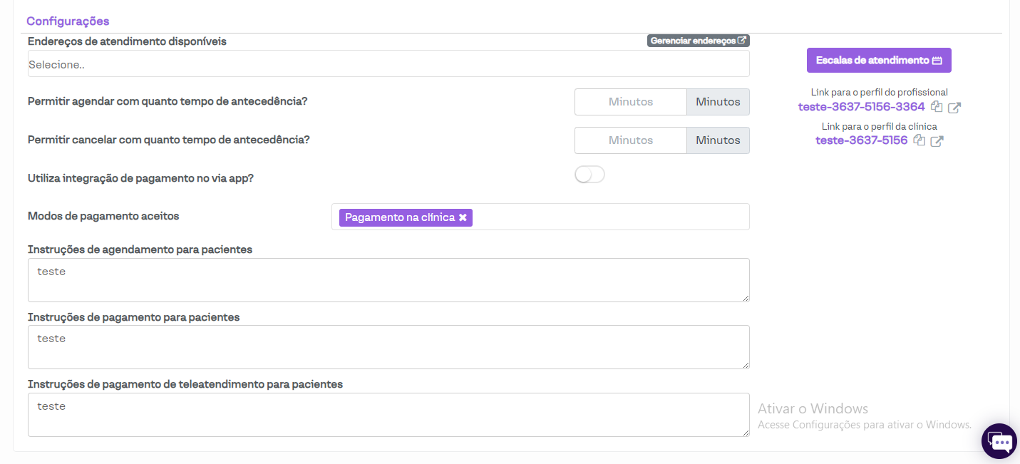 Nas configurações ficam disponíveis os ajustes que podem ser realizados para os agendamento online. Nelas são possíveis escolher os locais de atendimento, configurar formas de pagamento adicionar instruções extras para o paciente.