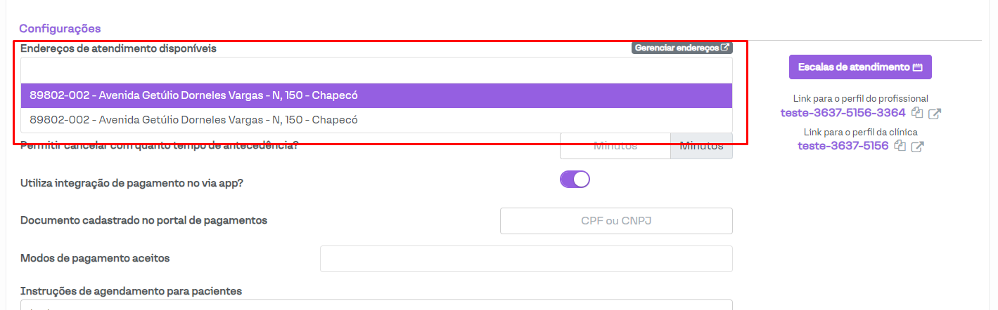 O primeiro campo a ser configurado é o de "Endereço de atendimentos disponíveis". Esse campo é obrigatório para que seja possível configurar os horários das escalas onde o profissional atenderá de forma online.