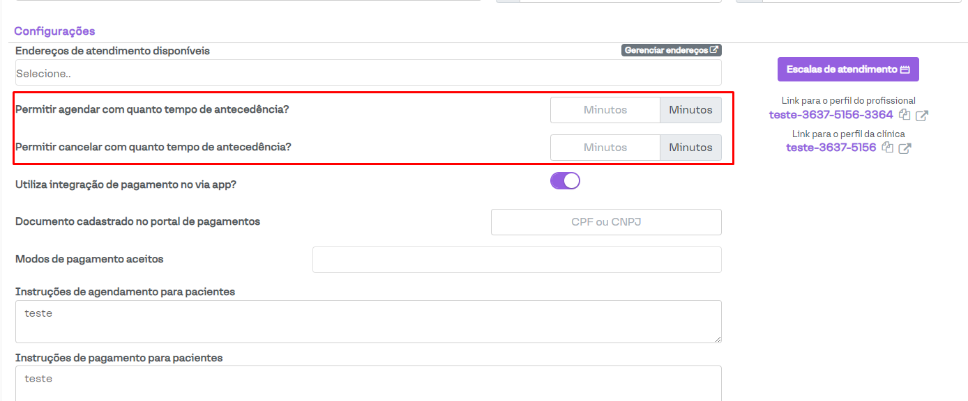 O tempo de antecedência deve ser sempre inserido em formato de minutos, sendo assim, caso o profissional queira que seja possível agendar ou cancelar com 1 hora de antecedência, será preciso inserir 60 minutos nesses campos.