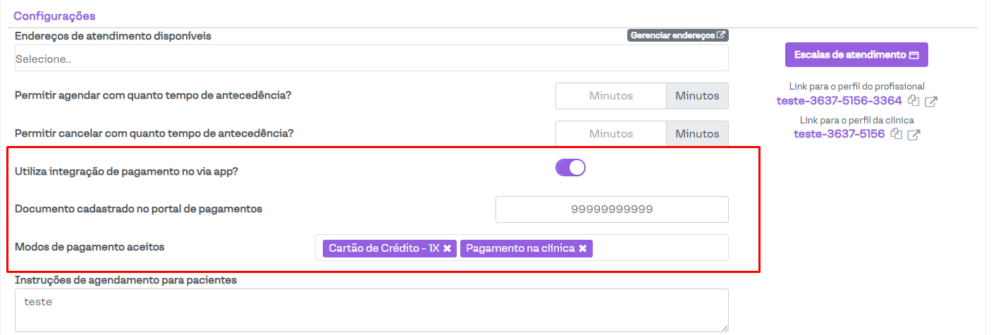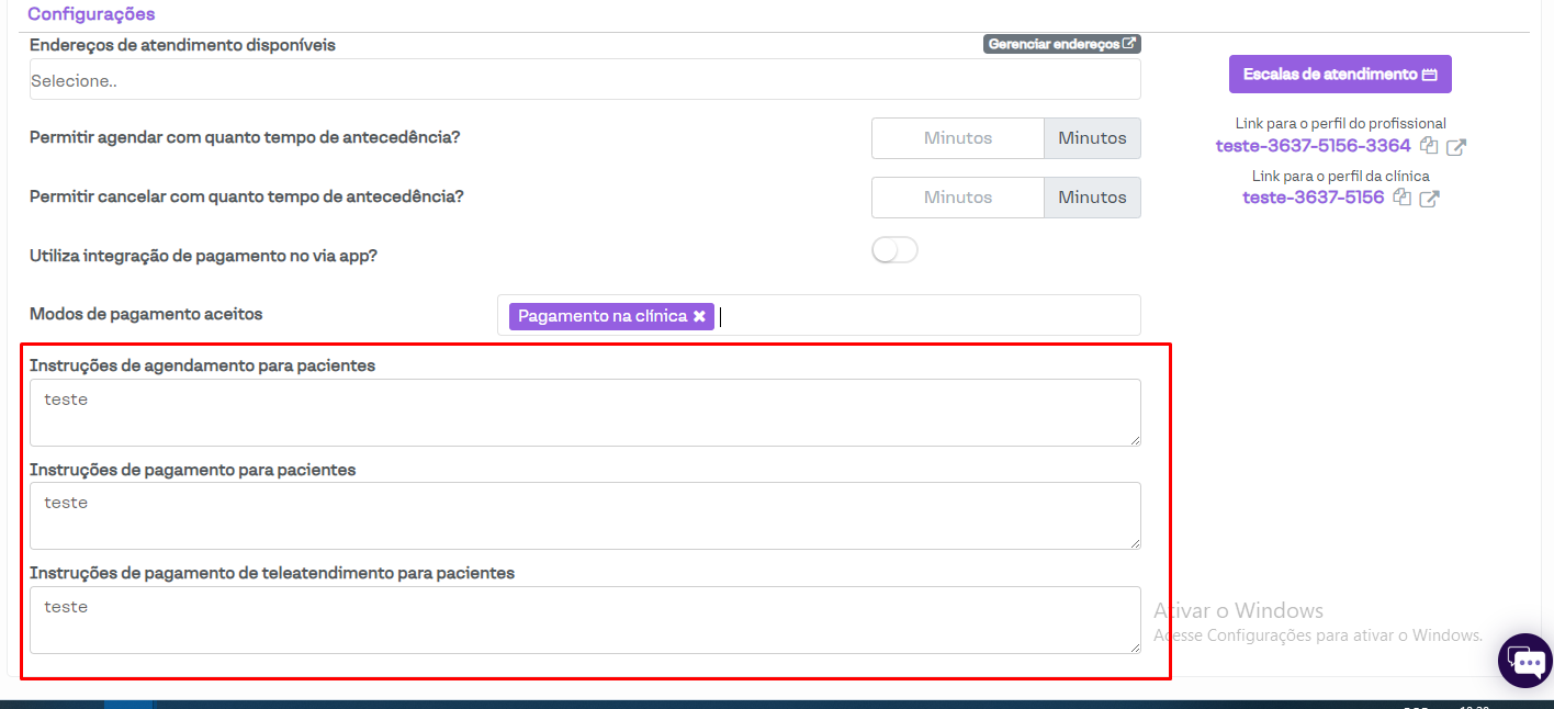 As instruções são campos de texto livre onde profissional pode estar descrevendo orientações para o paciente referente ao agendamento e pagamentos presenciais ou por tele atendimento.