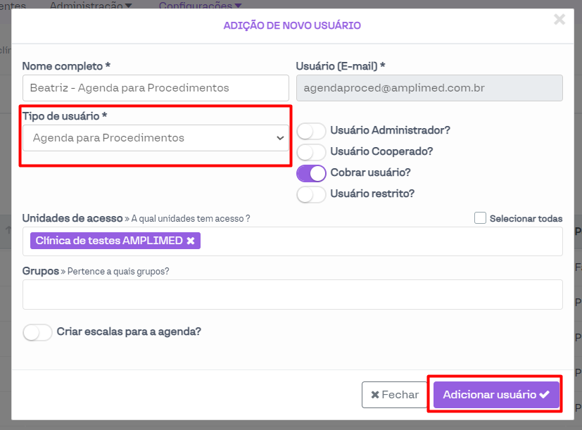 Selecione o tipo de usuário como “Agenda para procedimentos”.