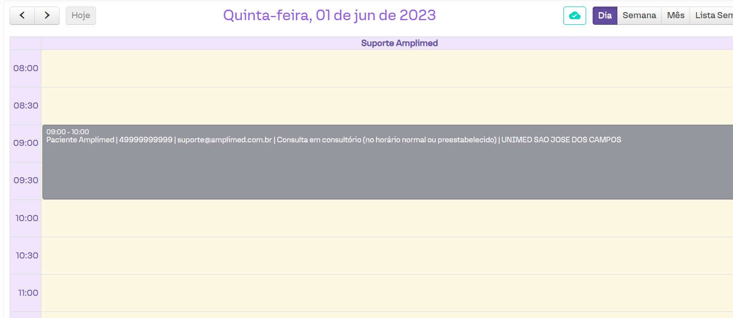 Quando há algum agendamento no dia, ele irá aparecer na agenda do dia, muito parecido com a imagem a seguir: