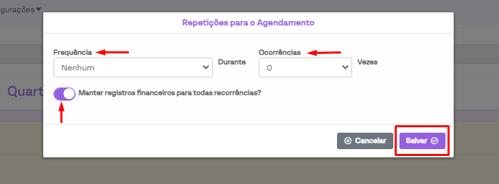 Outra opção importante neste procedimento é a de "Manter registros financeiros para todas recorrências?". Com ela ativada, todos os agendamentos terão uma conta criada, isso é importante para quando o pagamento é feito em cada uma das consultas realizadas. Já ao ser desativada, o agendamentos repetidos não terão uma conta criada, isso pode ser usada ao ser realizado um pacote com pagamento integral na primeira consulta e os demais não são realizados pagamentos, por exemplo.