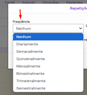 A "Frequência" se refere a regularidade dos atendimentos, ou seja, de quanto em quanto tempo essa consulta precisa ser realizada. As opções disponíveis são: diária, semanal, quinzenal, mensal, bimestral, trimestral ou semestral.