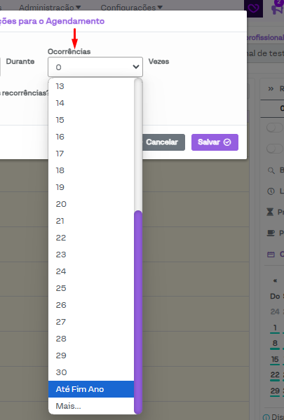 As "Ocorrências" se referem a quantidade total de agendamentos que devem ser criados. As opções variam de "0" a "30", com duas opções adicionais, sendo elas a "Até Fim Ano" (que cria agendamentos até o fim do ano, respeitando a frequência selecionada) e a "Mais.." (permite inserir o número desejado de agendamentos no campo "Vezes", sempre respeitando a frequência selecionada).