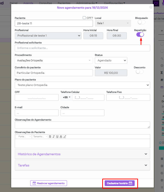 Selecionado o horário, será aberta um nova janela para inserir as informações para criar um agendamento. Será preciso preencher as informações normalmente, como de costume. E após o preenchimento, ative a opção "Repetição".