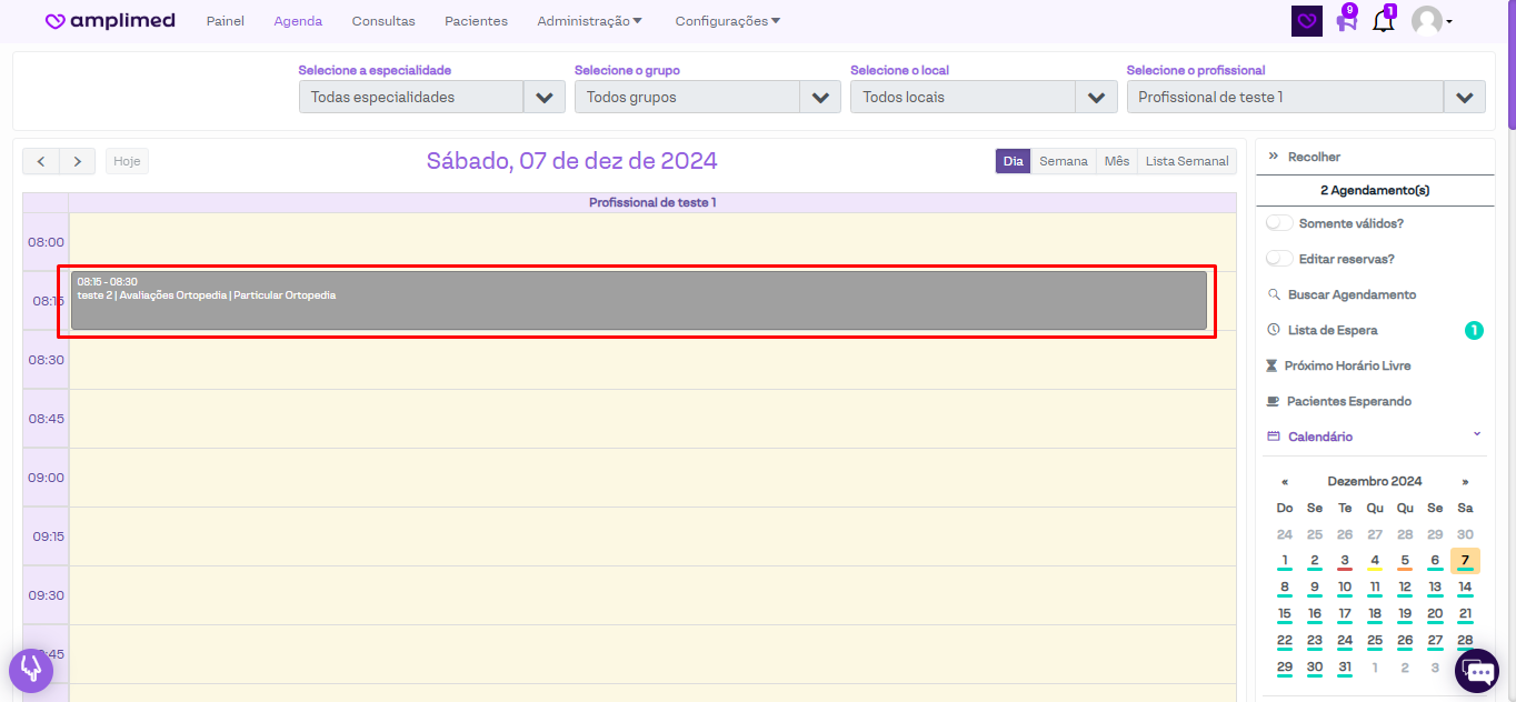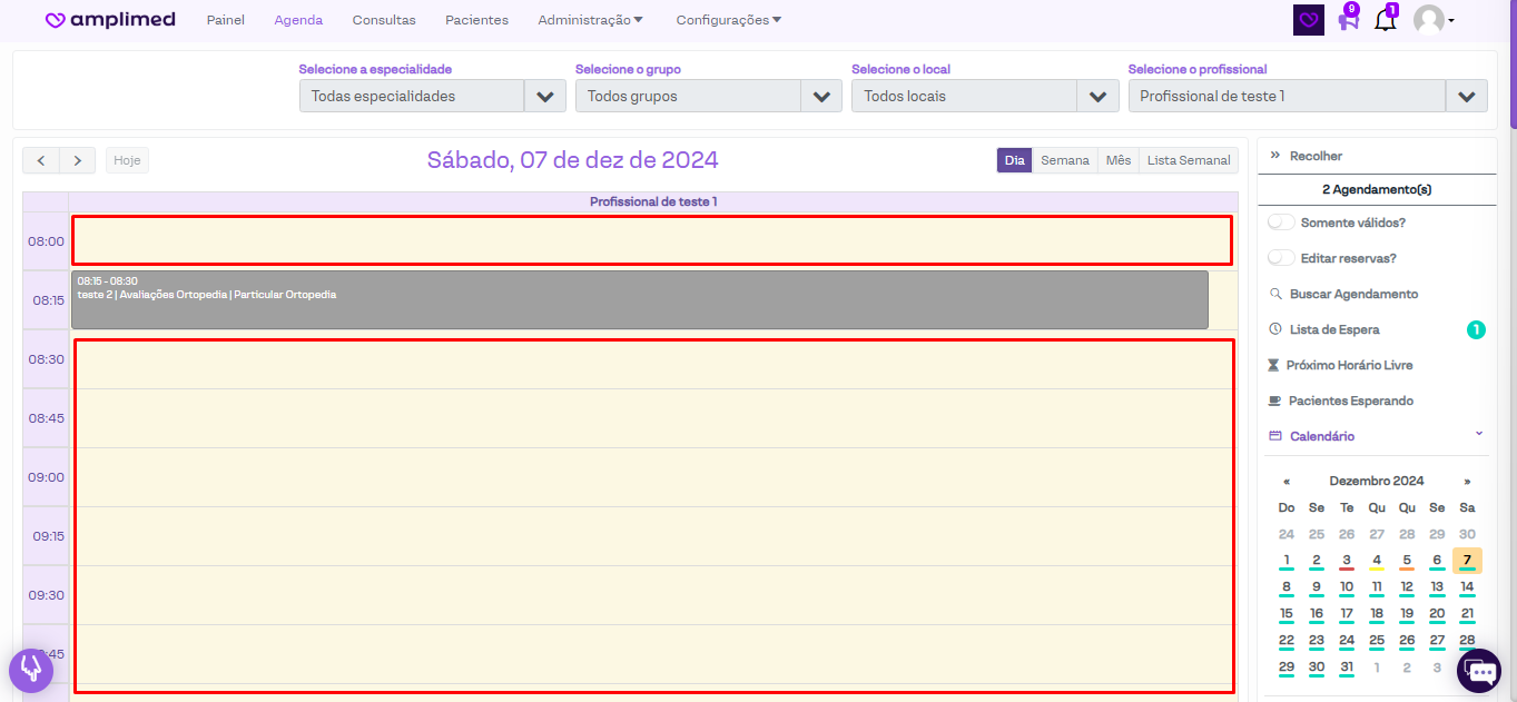 Os campos procedimento e convênio podem ser selecionados conforme a necessidade. Porém, é preciso lembrar que eles precisam estar cadastrados no sistema e o profissional ter sido liberado para atendê-los.