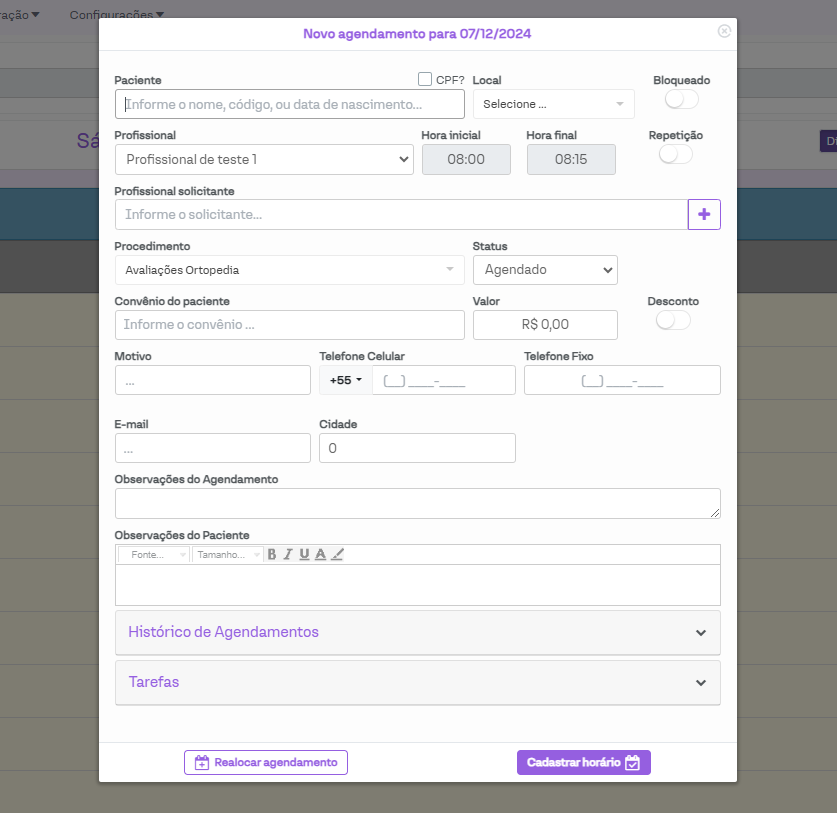 Após clicar nesta área, será aberta uma janela para inserir as informações do agendamento.