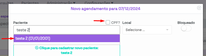 Primeiro, digite o nome ou o código do cadastro do paciente que deseja agendar. Caso preferir, é possível ativar a opção "CPF?" para que a busca seja feita por esse documento.
