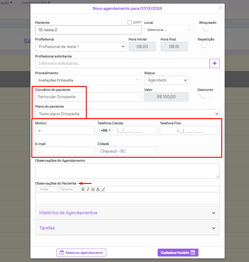 Selecionado o paciente, as informações de seu cadastro serão carregadas para o agendamento, como o convênio, o plano, as observações do paciente e as suas informações particulares. Para mais informações sobre as opções e funções do cadastro, veja: