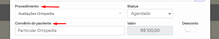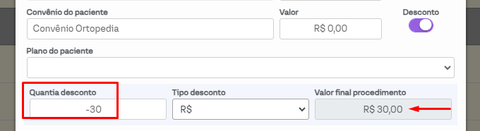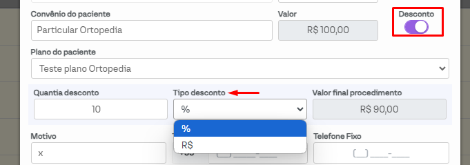 Em casos que é preciso ajustar o valor de um agendamento, é possível usar a opção de "desconto". Com ela, é possível inserir um valor de desconto ou de juros sem alterar o valor que foi ajustado como padrão para o procedimento atendido pelo convênio informado. Há dois tipos de descontos, o por percentual e o por unidade (moeda de reais) sobre o valor do procedimento.
