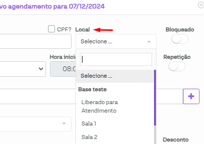 O local permite indicar onde será atendido este agendamento, evitando conflitos de horário de consulta em clínicas que os profissionais compartilham uma determinada sala para o atendimento de algum procedimento ou mesmo da própria consulta. Ele pode ser um campo obrigatório, caso desejar