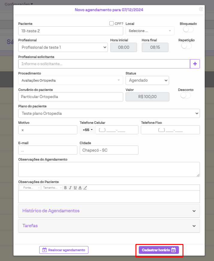 Após preenchida as informações do agendamento conforme necessário, basta clicar no botão "cadastrar horário" e prontinho! O agendamento será criado na agenda do profissional.