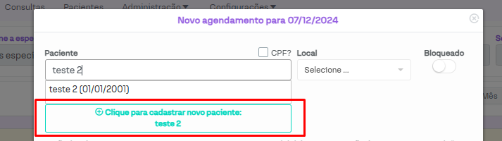 Em casos que o paciente ainda não possui cadastro, basta inserir seu nome no campo "Paciente" e depois clicar em "Clique para cadastrar novo paciente: ". Assim, o cadastro será criado e poderá ser utilizado posteriormente.