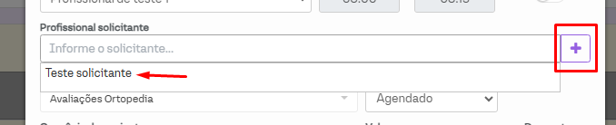 Algumas consultas podem possuir um profissional solicitante e caso desejar informar no agendamento, basta inserir o nome dele(a) no campo. Lembrando que ele precisa estar cadastrado em seu sistema e caso você tenha permissão em seu usuário, irá aparecer um ícone com o símbolo de mais, em roxo, para que possa cadastrar um novo profissional solicitante.
