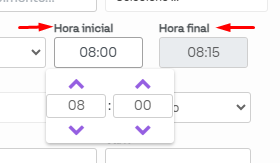 Apesar de ser possível selecionar diretamente no horário desejado na agenda, também é permitido alterar o horário dentro da criação do agendamento. Para isso, basta clicar sobre o horário (inicial e final) e será exibido um campo para ajusta-lo conforme necessário.