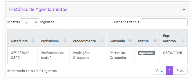 Na janela de criação do agendamento, é possível visualizar ou buscar o histórico de agendamentos do paciente rapidamente. Isso pode ser útil para visualizar o status anterior da consulta, o dia que foi realizada, a expectativa de retorno e outras informações que auxiliam no fluxo da clínica.