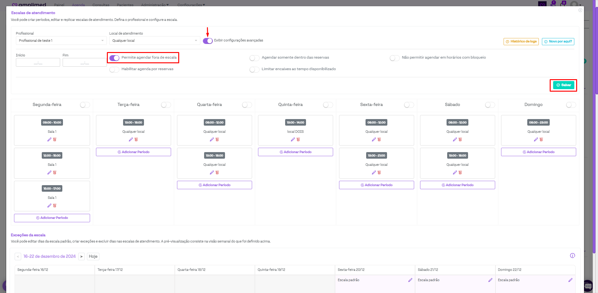Nem sempre é possível marcar todos os agendamentos para escala que foi definida, podendo ser preciso atender um paciente antes ou depois deste horário. Para estes casos, existe a possibilidade de criar agendamentos fora de sua escala.