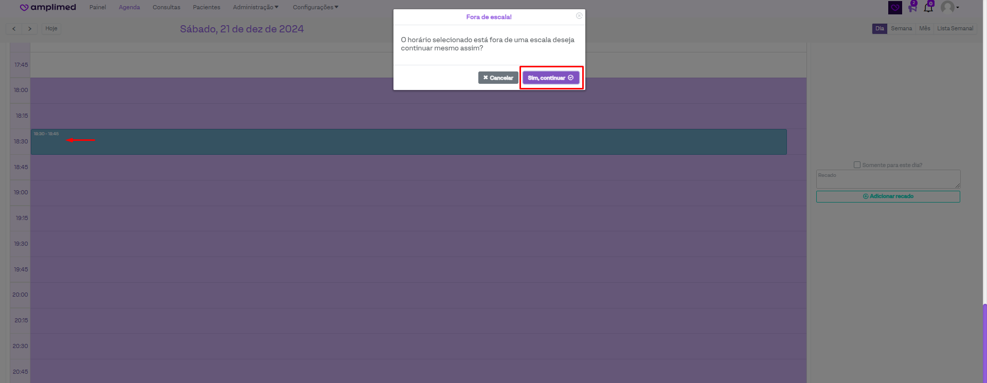 Realizado o procedimento anterior, para criar os agendamentos fora da escala, acesse a agenda e selecione o horário desejado que está fora da escala padrão. Será exibida uma mensagem de aviso para confirmar a criação do agendamento e basta clicar no botão "Sim, continuar".