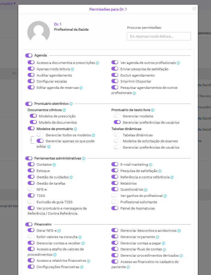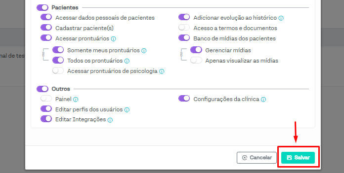 Dependendo da finalidade de determinado usuário, algumas funções podem ser preciso estar ativadas ou desativadas para melhorar o fluxo em sua clínica. Assim, a partir das permissões dos usuários, é possível fazer gerenciamento destas opções pelo sistema.