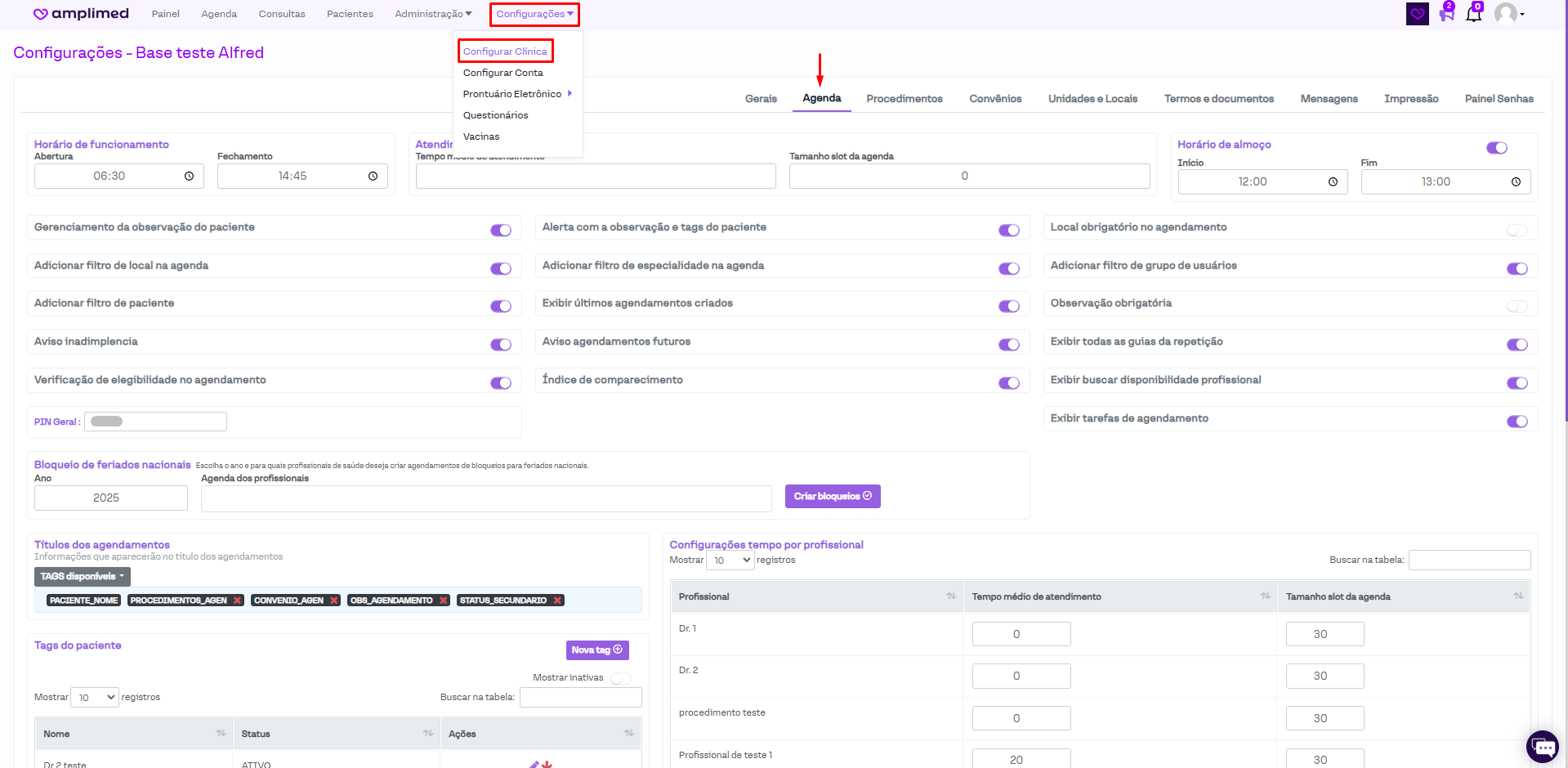 Acesse: Configurações > Configurar clínica > Agenda.