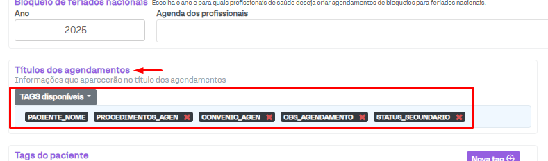 Caso desejar inserir um título de agendamento, acesse a aba "Agenda", em "Configurações > Configurar clínica". Busque pelo campo "Títulos dos agendamentos", que ficará localizada à direita nesta página. Serão apresentadas as tags já utilizadas em sua clínica e será possível adicionar ou remover elas conforme preferir.