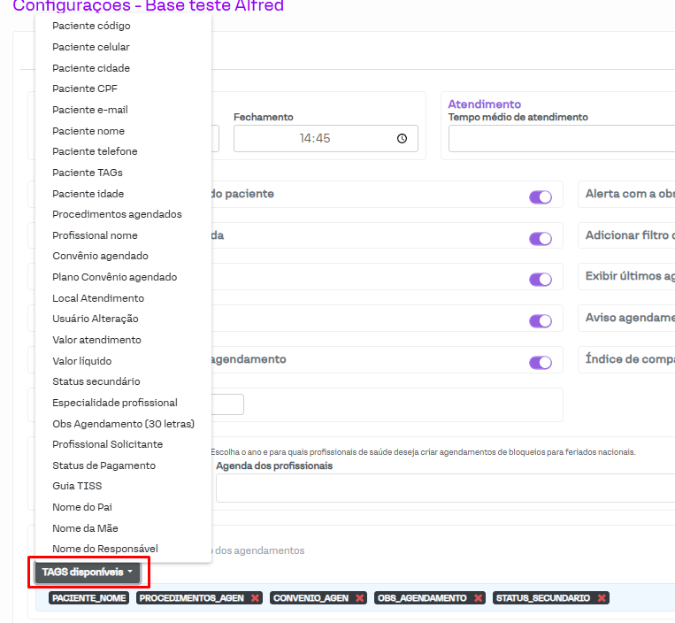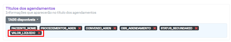 Para adicionar, clique em "Tags disponíveis". Será aberta uma lista de opções, as quais irão ser mostradas no agendamento quando selecionadas. Em nosso exemplo, vamos clicar em "Valor líquido" (mostra o valor final do agendamento, contabilizando os descontos ou juros adicionados ao valor padrão).