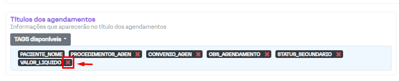 Para remover um título de agendamento que não seja mais necessário, basta ir até a aba "Agenda", em "Configurações > Configurar clínica", encontrar o título que deseja remover e clicar sobre o ícone de "X", em vermelho, ao lado dele.