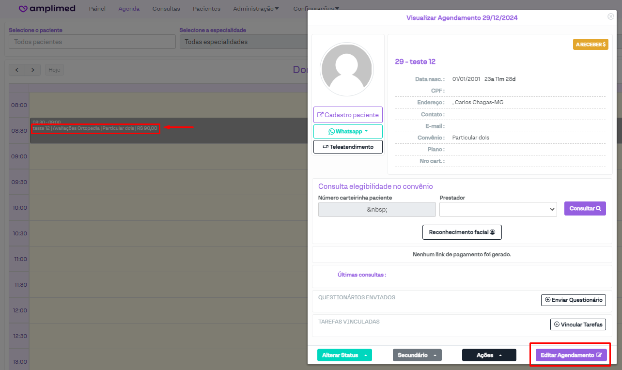 Primeiro, encontre o agendamento que deseja atualizar os títulos (após o ajuste deles) e clique sobre ele. Na nova janela aberta, clique em "Editar agendamento".