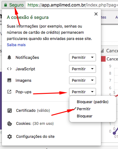 Para algumas funções do Amplimed, precisamos que os pop-ups estejam permitidas pelo navegador. Para fazer isso, você deve clicar em seguro na barra de endereços do navegador e depois permitir os pop-ups no sistema.