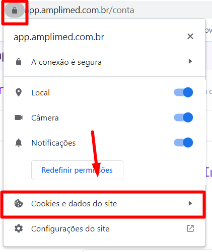 A limpeza de cookies serve para limpar arquivos de sessão inválidos. Para fazer a limpeza desses cookies e voltar a funcionalidade normal do sistema, é preciso clicar em seguro do lado do endereço do Amplimed e depois clicar em cookies.