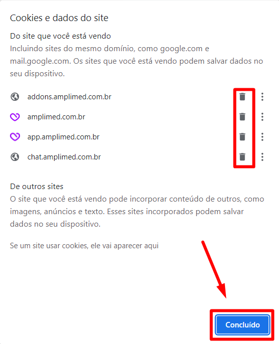 Uma nova janela se abrirá com os cookies em uso. Você deve remover todos da lista que aparecerá, clicando no botão remover. Ao final, quando já tiver removido todos, você pode clicar em concluir e depois atualizar a página do Amplimed.
