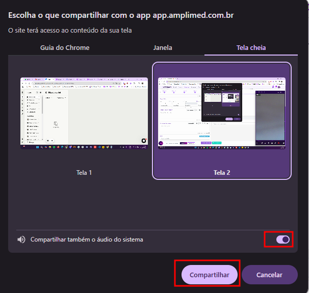 Escolha a guia, janela ou tela que capturará o som e clique em Compartilhar.