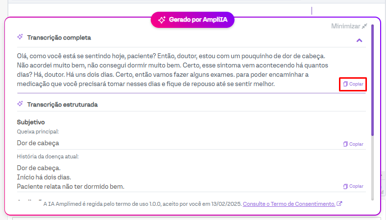 Então caso deseje utilizar a transcrição da IA, poderá clicar para copiar o tópico que desejar:
