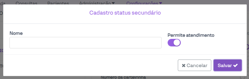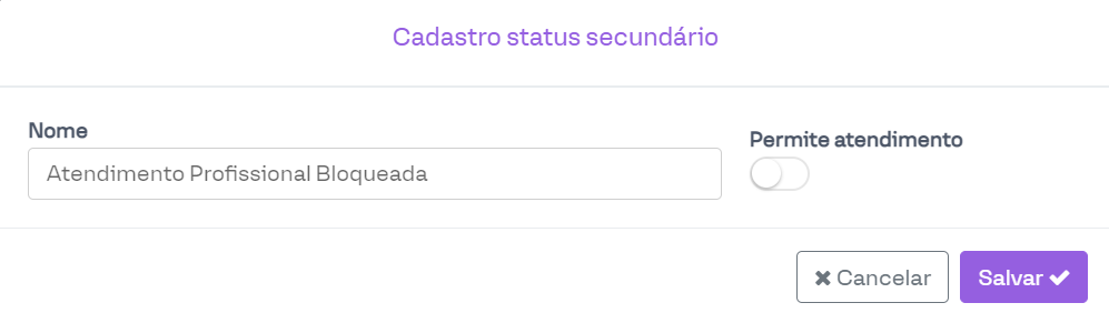 Para o segundo caso, em que deseja-se bloquear apenas alguns agendamentos, é necessário criar mais um status secundário sem a opção de "Permite atendimento" ativado. Por exemplo: