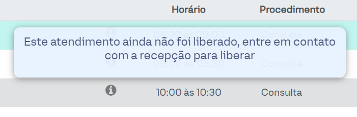 Assim, quando o profissional de saúde for atender sem o status secundário de liberação vinculado ao agendamento, este aviso aparecerá na tela e não permitirá o atendimento: