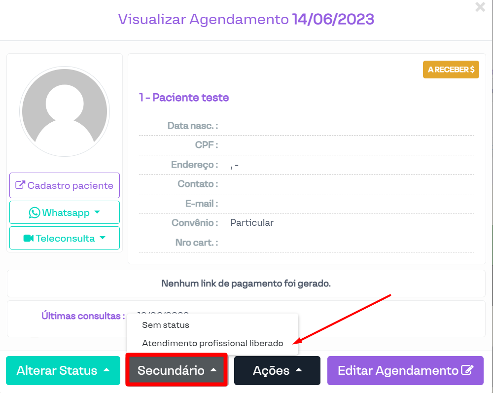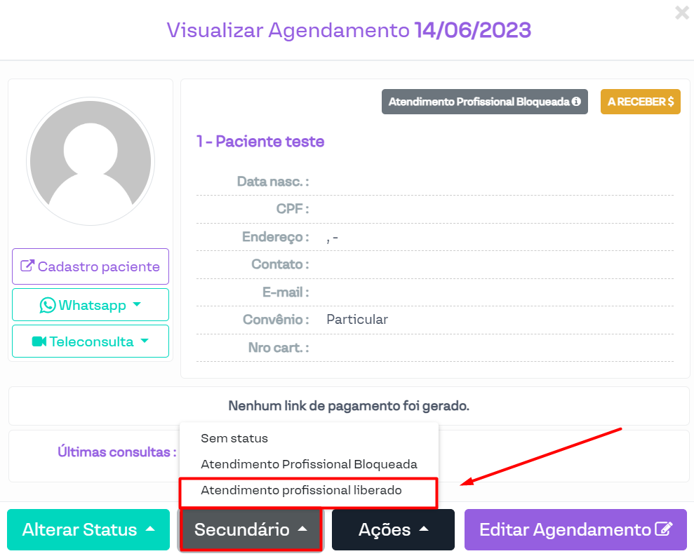 Para liberar o atendimento, basta que qualquer usuário com acesso a agenda do profissional em questão abra o agendamento e coloque o status secundário de liberação: