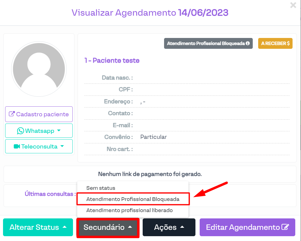 Deste modo, será necessário abrir o agendamento que deseja bloquear atendimento e nos status secundários selecionar o status que bloqueia o atendimento, por exemplo: