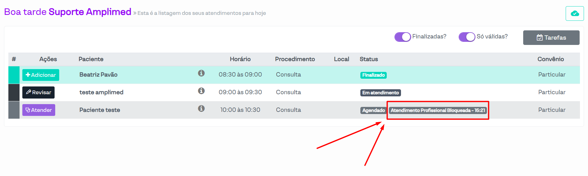 Após isto, o profissional não poderá atender e mostrará também o status secundário que está bloqueando o atendimento: