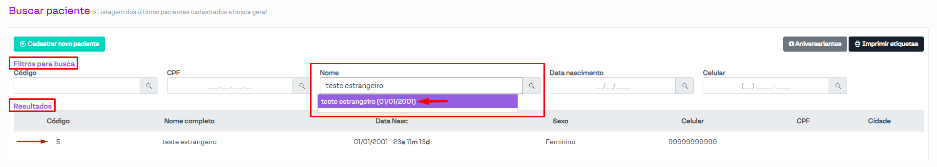 Por exemplo, buscando pelo nome exato que foi cadastrado, será exibida as opções encontradas listadas no campo "Nome" e também na lista de "Resultados". Para acessar o cadastro encontrado, basta clicar sobre ele (seja no campo "Nome" ou nos "Resultados").