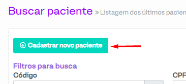 Para cadastrar um paciente pela aba de "Pacientes", é preciso clicar no botão "Cadastrar novo paciente", localizado à esquerda, na parte superior da tela.