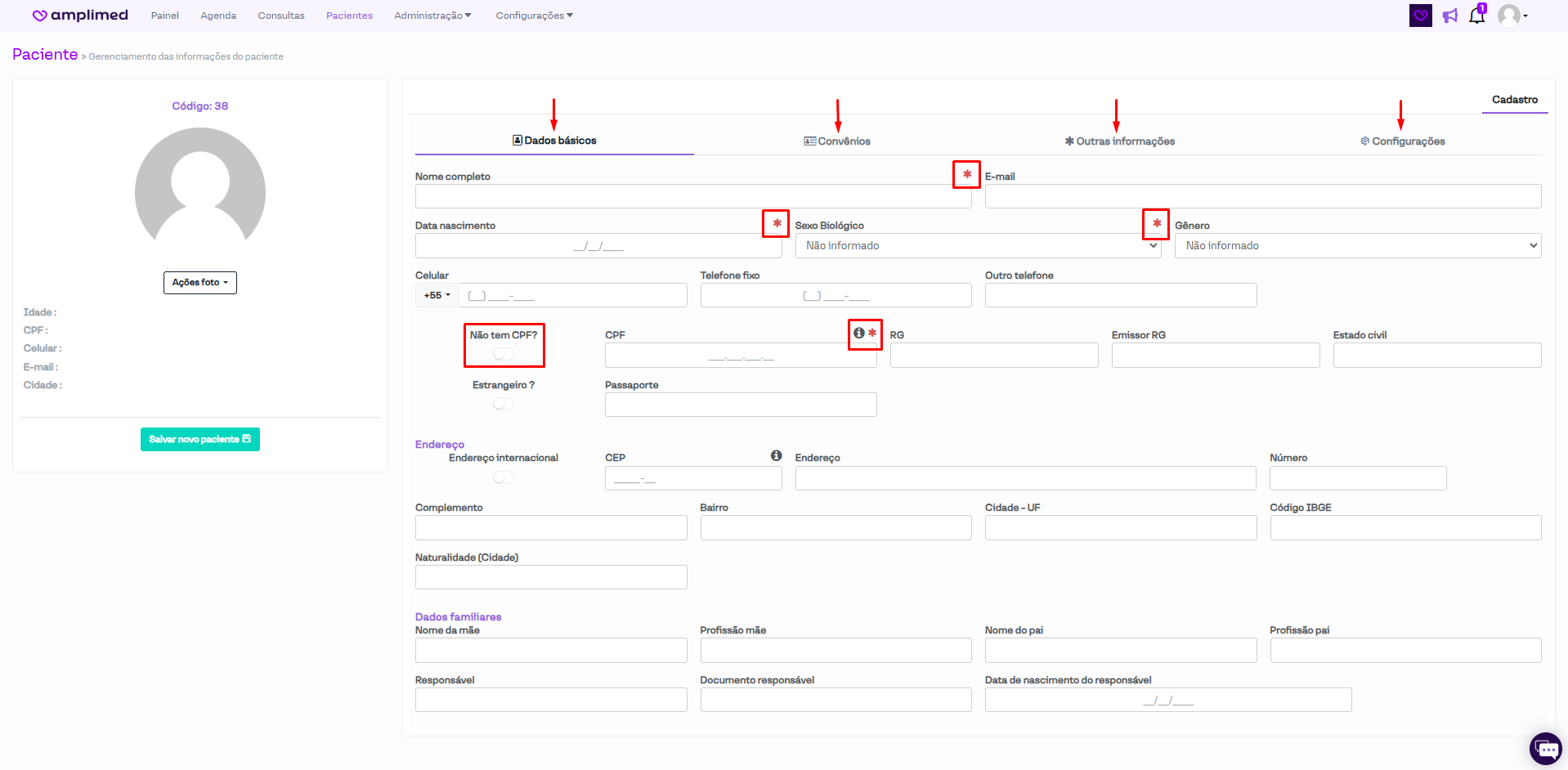 Caso o paciente não tenha CPF, é possível ativar a função "Não tem CPF?" e informar o motivo. Já os campos que contém um asterisco vermelho são obrigatórios e podem ser ajustados conforme o fluxo da sua clínica. Para ver como configurar eles, acesse o artigo: Campos Obrigatórios no Cadastro do Paciente