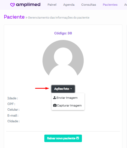 Além das informações pessoais, é possível adicionar uma foto ao cadastro. Basta clicar no botão "Ações foto" e escolher entre enviar uma imagem salva em seu computador ou tirar uma foto do paciente, caso tiver uma câmera acoplada em seu computador.
